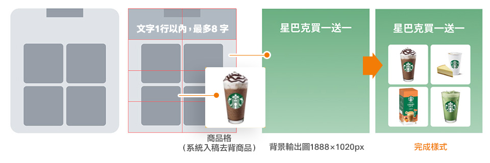 - 文字可編輯區塊為上方4等分,商品可編輯區塊為下方6等分。