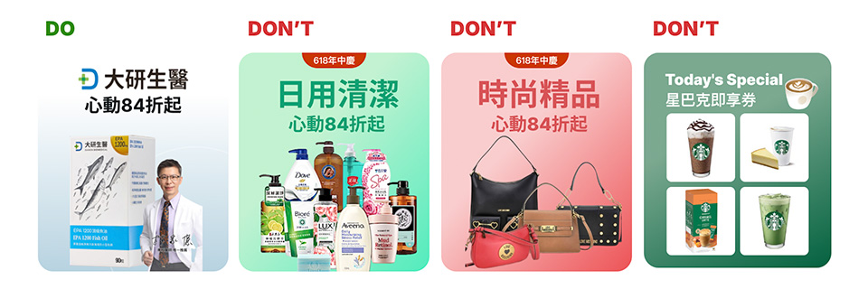 - 為突顯商品內容,裝飾性元素請避免使用過多顏色與特效。