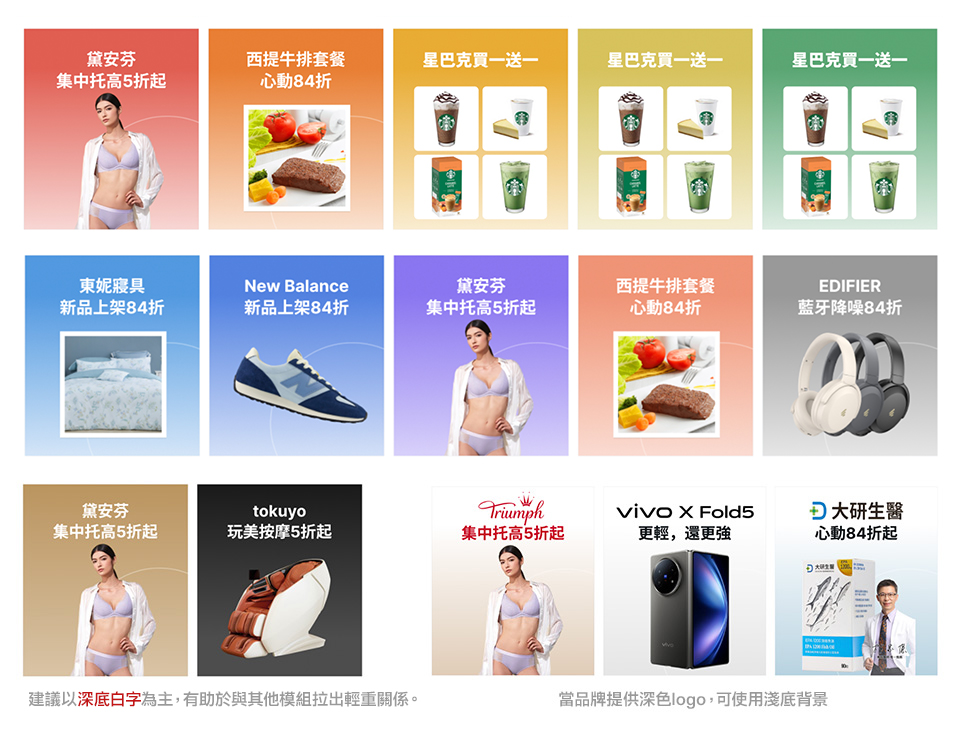 - 範例檔PSD內提供12個參考色套版,建議以深底白字為主,亦可依據活動主色另製;當品牌提供深色logo,可使用淺底背景。