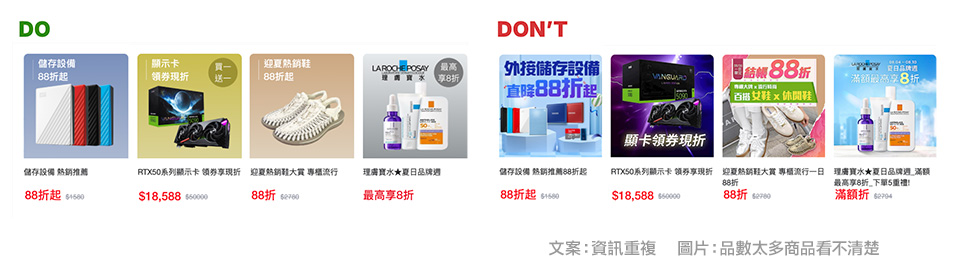 - 請勿設計過多裝飾元素、複雜或沒有意義的商品與背景。
