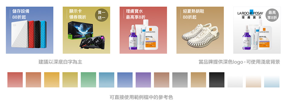 - 建議以深底白字為主,PSD檔提供12個參考色;當品牌提供深色logo,可使用淺底背景。